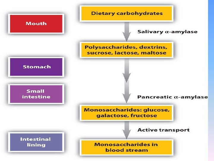 Fate of absorbed sugars: Monosaccharides (glucose, galactose and fructose) resulting from carbohydrate digestion are absorbed and undergo the following: A. Uptake by tissues (liver): After absorption the liver takes up sugars, where galactose and fructose are converted into glucose. B. Glucose utilization by tissues: Glucose may undergo one of the following fate: