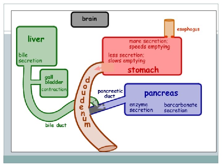 Mixing and Empting Actions Liquid pass quite rapidly Solid remain until they are well mixed Fatty foods remain 3 -6 hours Proteins: quicker Carbohydrates: faster than protein and fats As food enters the duodenum, accessory organs add their secretions Pancreas, liver and gallbladder