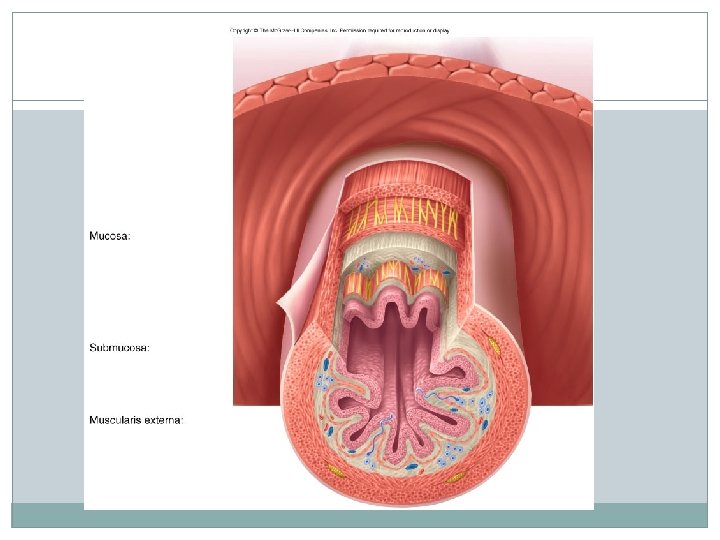 General Characteristics 9 -meter muscular tube Structure of the Wall Mucosa: mucous membrane Inner most layer Protects the underlying tissue Carries out secretion and absorption Epithelium, connective tissue, and smooth muscle Tiny folds and projection in the lumen, passageway Increase absorption through increased surface area Glands: secrete mucus and digestive enzymes
