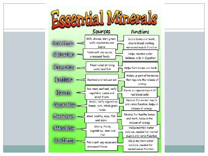 Minerals Elements other than carbon that are essential Most minerals are in the bone and teeth Usually in organic compounds Some are in inorganic compounds or free ions Functions: structural material, enzymes, and vital roles in metabolic processes Major Minerals: Ca, P, K, S, Na, Cl, and Mg Trace Elements: Fe, Mn, Cu, I, Co, Zn, F, Se, Cr