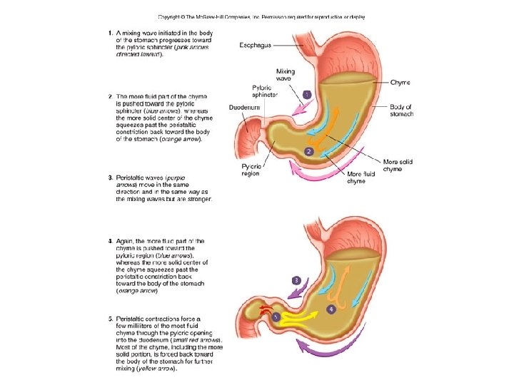 c. Absorption 1. Salts 2. Glucose 3. Alcohol 4. Asprin 5. Lipid Soluble drugs 6. Water d. Propulsion – Peristalsis 1. Chyme- small food particles & gastric juices. 2. Mixing waves- weak contraction which mixes food with stomach secretions. 3. Peristalic waves- stronger contractions that force chyme toward and through the pyloric sphincter. e. Intrinsic Factor Parietal & Chief Cells – aids in Vitamin B 12 absorption by small intestines, which is important in RBC production.