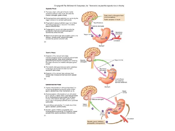 f. Regulation of Stomach Function 1. Beginning of Digestion -Primary by involuntary control center of the brain & hormones – Positive Feedback Brain (hypothalmus) Cephalic Phase - Smell, think, see, hear Medulla Gastric phase -Gastric Glands Gastirc Juices Continued Reflex (Stretching of stomach by food) 2. Ending of Digestion Intestinal phase -Presence of acid in upper small intestine triggers nerve reflex to stimulate contraction of the pyloric valve, which prevents more acid from entering. -Secretin & Cholecystokinin (CCK) intestinal hormones. Inhibits stomach peristalsis & stimulate pancreatic enzyme & bile into small intestines.
