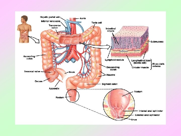 function : * absorb water * then eliminate them as feces compared to the small intestine : diameter is bigger but its length is far shorter (only about 5') their tone causes the LI wall to pucker into pocketlike sacs called ‘haustra’