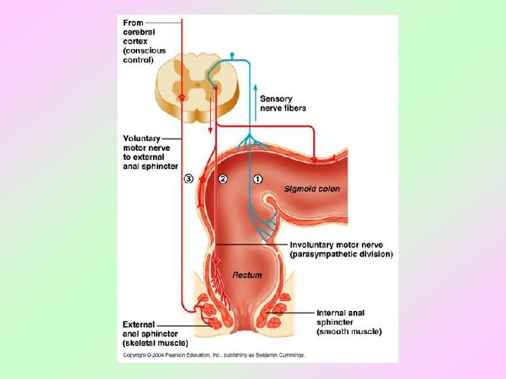 DEFECATION after absorption of electrolite & H 2 O : colon forming of feces : in the colon feces in the rectum : pressure of rectum reflex of defecation problems : constipation (absorption >>) diarrhea (absorption <<)