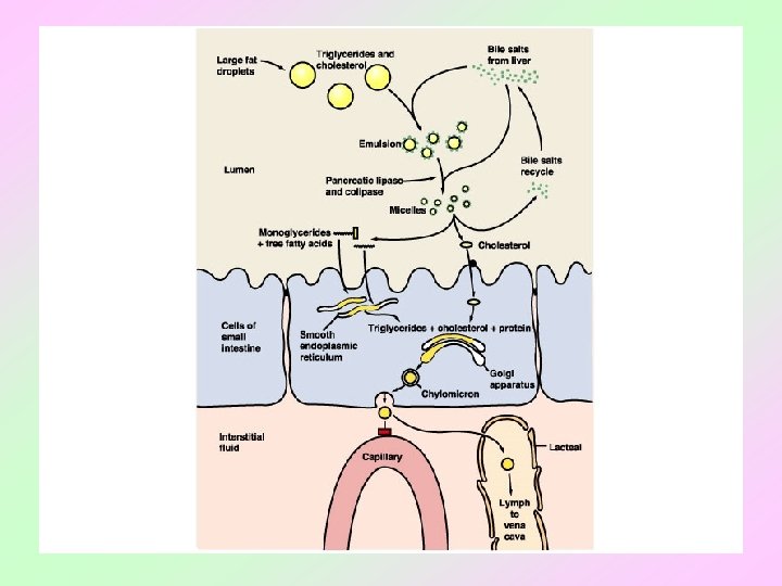 BREAK DOWN OF LIPID fats are not digested until the small intestine there they are first emulsified by bile and then acted upon by pancreatic lipase most ingested fats are broken down into glycerol, monoglycerides, and fatty acids & monoglycerides : passively enter intestinal epithelial cells they're combined with cholesterol & proteins form chylomicrons