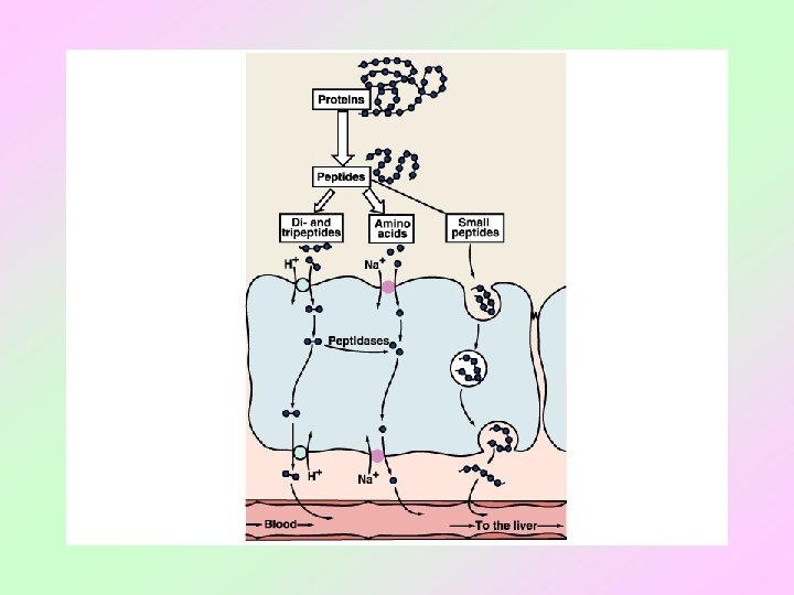 BREAK DOWN OF PROTEIN protein digestion begins in the stomach : pepsin in the SI, protein digestion continues with trypsin and many other proteases the end result : free amino acids enter the intestinal epithelial cells via cotransport with sodium