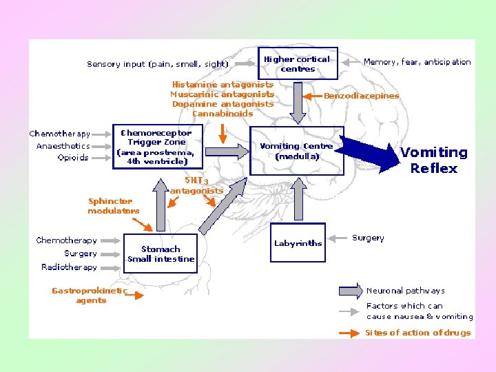 NAUSEA – VOMITING MECHANISM • stimulasi pusat muntah di medula, yang mengendalikan zona pemicu kemoreseptor (Chemoreceptor Trigger Zone – CTZ) di otak • Peristaltik lambung menurun • Tonus duodenum & jejunum meningkat • Reflux lambung • Kontraksi lambung, kontraksi diafragma, kontraksi otot abdomen