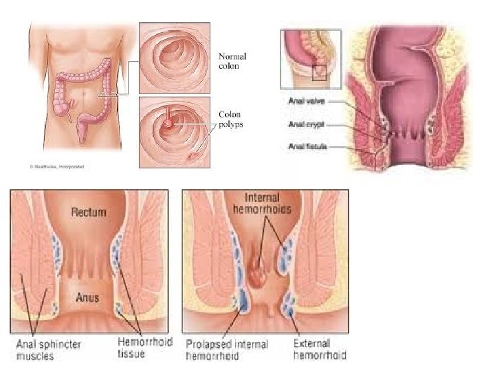 Abnormal Conditions Continued • Anal fistula – abnormal tube -like passageway near the anus • Colonic polyposis – polyps (out pouching) protrude from the mucous membrane of the colon • Diverticulosis – abnormal side pockets (outpouchings) in the intestinal wall