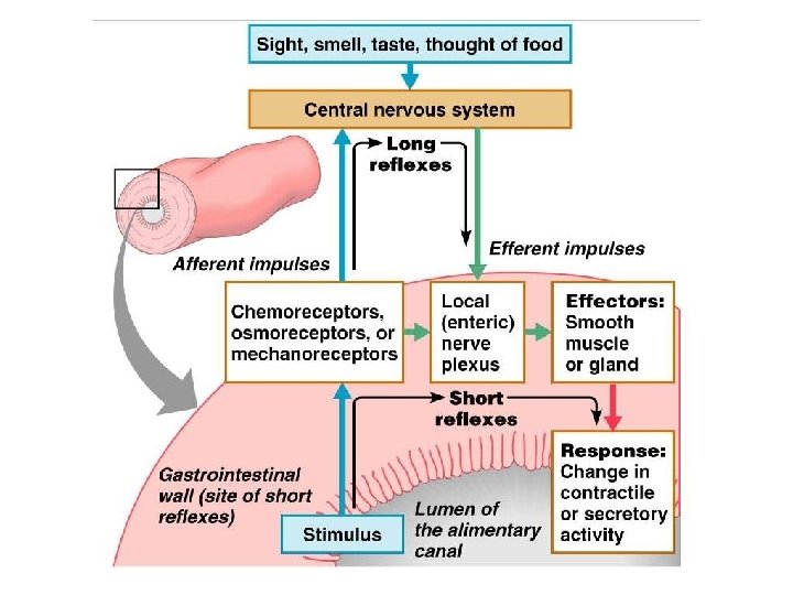 Receptors of the GI Tract • Mechano- and chemoreceptors respond to: – Stretch, osmolarity, and p. H – Presence of substrate, and end products of digestion • They initiate reflexes that: – –