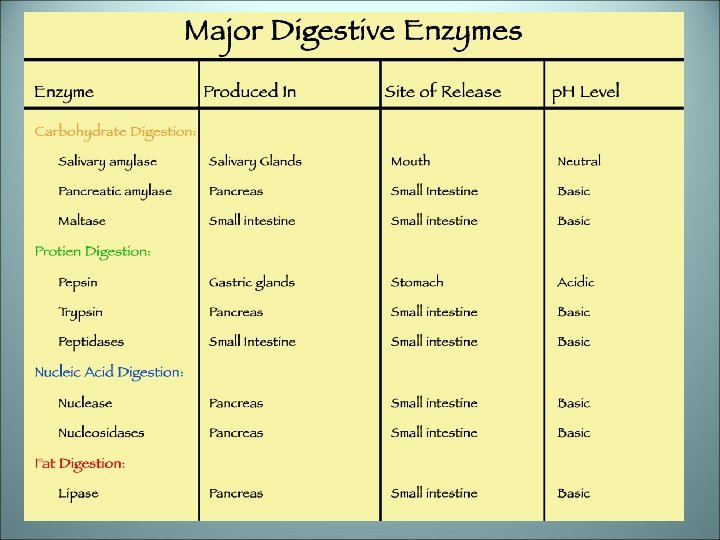 Interpreting Diagrams: Use the chart and diagrams on the previous 2 slides to answer the following: 1) How many different chemical reactions can an enzyme speed up? 1, 2, thousands 2) In the first diagram, the enzyme is helping convert sucrose (table sugar) into _______ and ________. 3) What kind of p. H level does salivary amylase need to work best in? ________ 4) In which organ would you find the enzyme pepsin? ________ 5) What does the enzyme pepsin help break down? __________ 6) Which organ of the digestive tract has the most enzymes helping it? __________