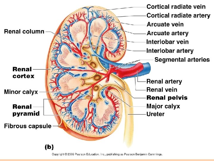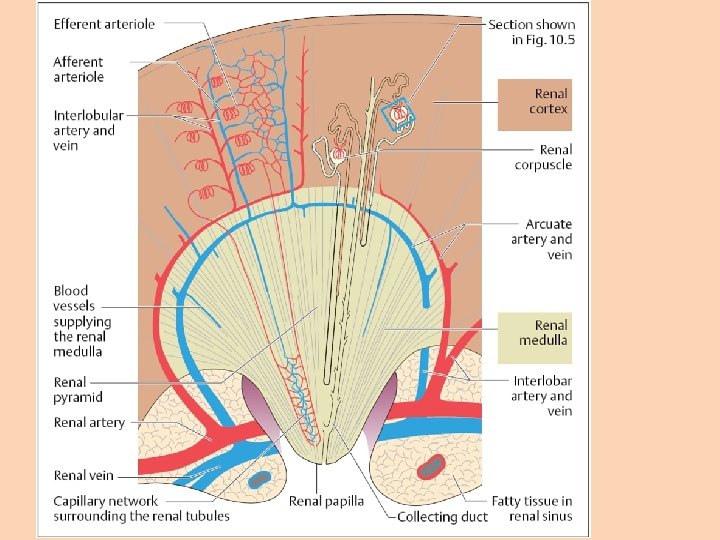 Kidney • Medulla – pyramids – Renal lobes • Cortex – Bertini columns – Convoluted part – Straight part • Renal artery – interlobar aa. –arcuate aa. – interlobular aa.