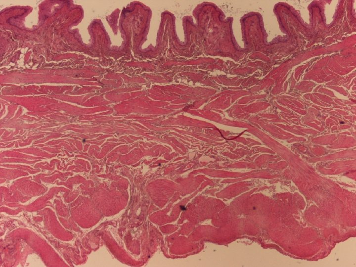 Urinary bladder • Urothelium • Dense fibro-elastic connective tissue in the lamina propria • Muscularis mucosae – Not forming a continous layer, only some islets of smooth muscle • Submucosa – loose connective tissue • Muscularis externa – Inner&outer longitudinal layers, middle circular layer • Serosa or Adventitia