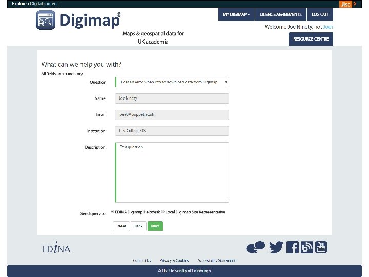 Social media http: //digimap. blogs. edina. ac. uk/ https: //www. facebook. com/EDINADigimap https: //twitter. com/EDINA_Digimap https: //www. youtube. com/user/EDINADigimap We use our social media to: • alert users to significant downtime periods or unexpected outages • announce updates to the services • offer free training • promote new help and support resources • signpost users to other relevant and interesting information