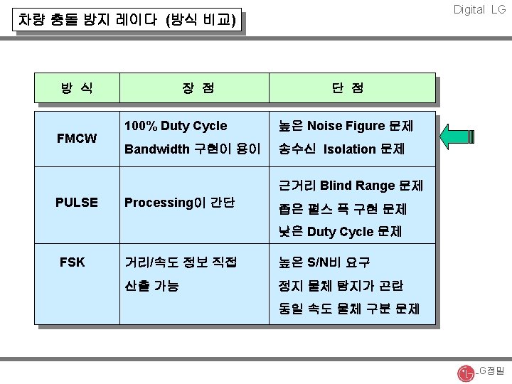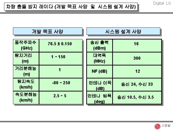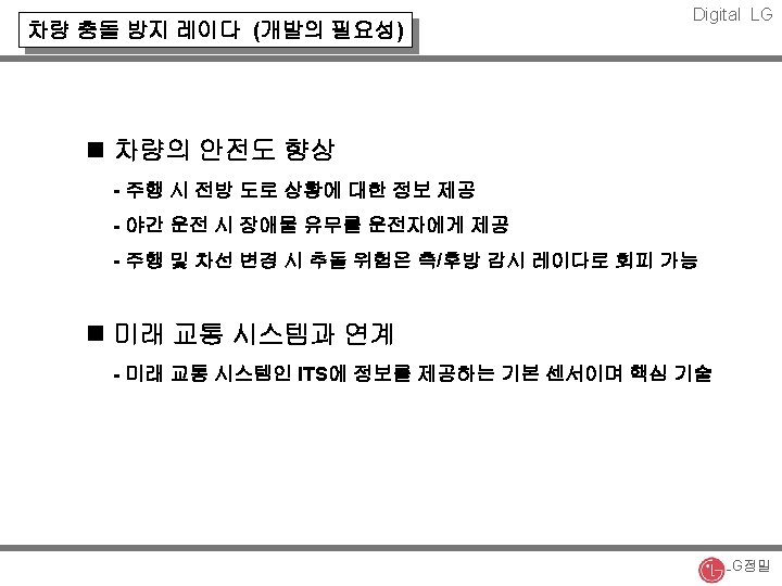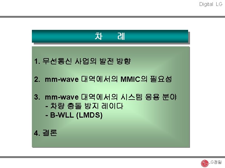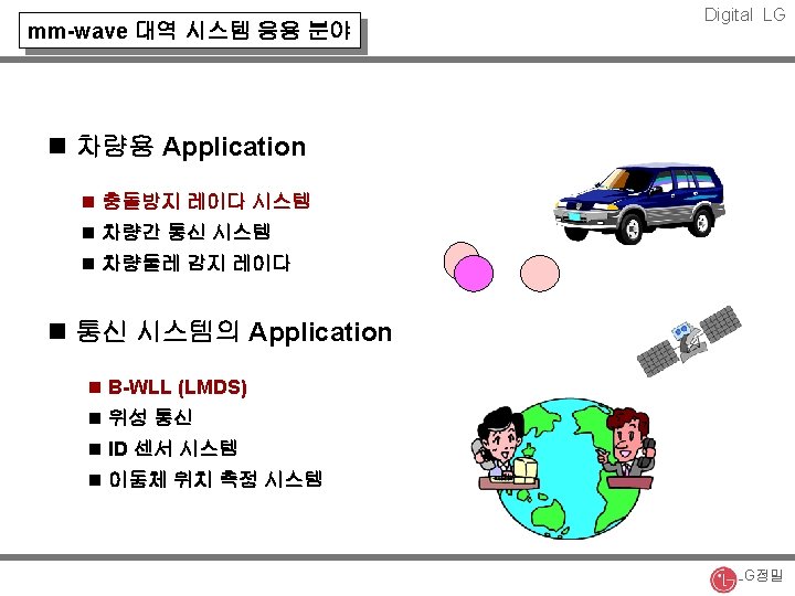 Digital LG 주파수에 따른 무선통신 사업의 발전 방향 Imaging Sys. 90 GHz FSS 29 GHz WLL 2. 4 GHz PCS 2. 0 GHz IMT 2000 2. 3 GHz CT-2 800 MHz 1 GHz 2 GHz CATV 28 GHz BWLL 24 GHz Car Radar 24 GHz 20 GHz Car Radar 94 GHz BWLL 66 GHz Car Radar 77 GHz 차량간 통신 60 GHz Car Radar 60 GHz 70 GHz 90 GHz LG정밀