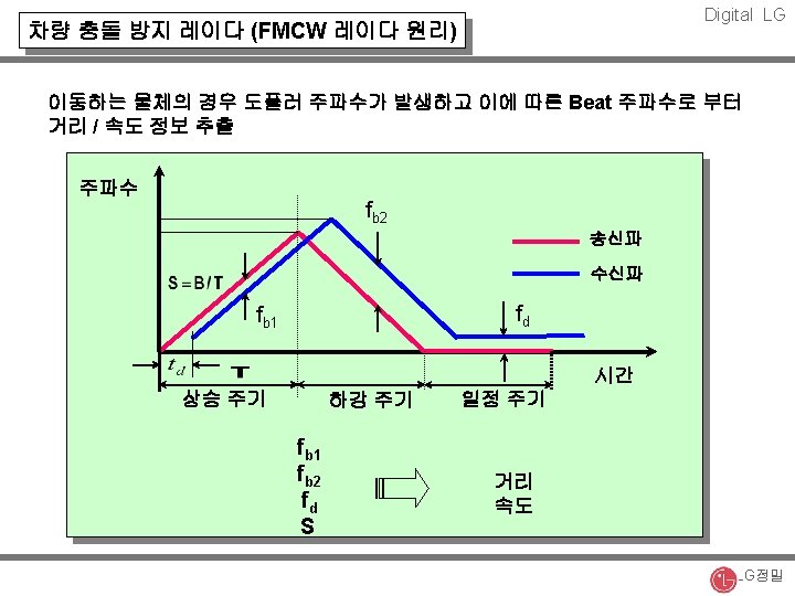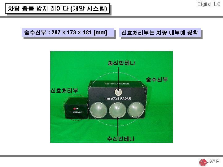 Digital LG 차량 충돌 방지 레이다 (시스템 블럭도) 송수신부 신호 처리부 Rx Ant. LNA Ant. Driver Mixer LPF Switch FPGA LPF Tx Ant. A/D Directional Coupler DSP D/A VCO LG정밀