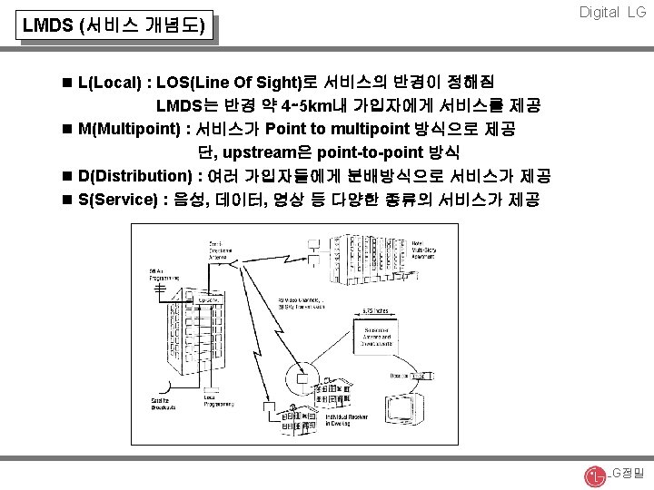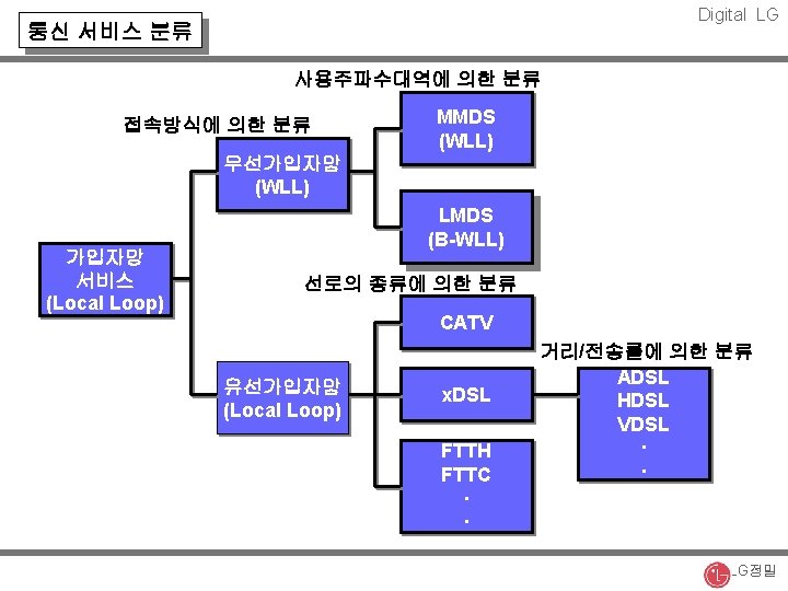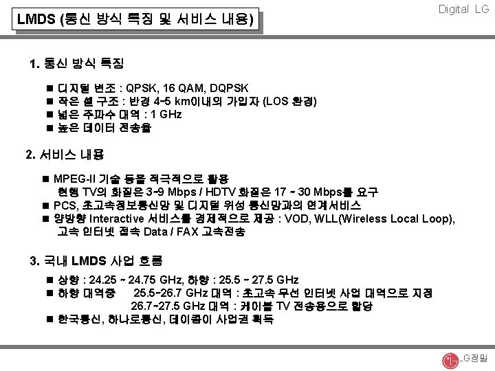 Digital LG 무선통신 시스템 개요 2 nd/2. 5 th Gen. PCS Cellular 00 Outdoor WATM (MBS) 20 T- Walking Speed 4 th Gen. IM High Speed 3 rd Gen. Indoor Still B-WLL Cordless Still Fixed Data rate (Mbps) Radio LAN Fixed Terminal Cable 0. 01 0. 1 1 10 100 LG정밀