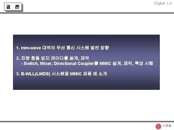 부품 MMIC 개발 추진 Digital LG n MMIC 추진 부품 ▶ Directional Coupler ▶ Mixer (Ga. As p. HEMT Single Ended Mixer) ▶ Switch (Single Pole Triple Throw) n 개발 협력 업체 ▶ 서울대 : Switch 설계, LG 종기원 제작 ▶ LG 종기원 : Coupler, Mixer 설계 및 제작 LG정밀