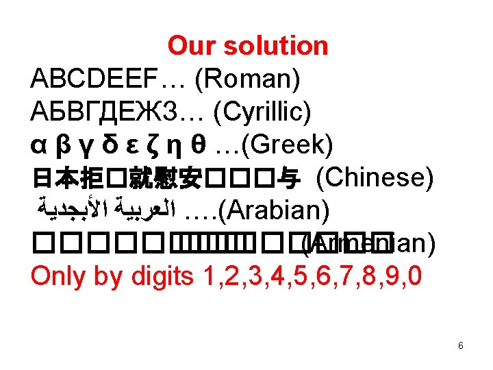 Digital number of languages Bulgarian – 0001000 Greek - 0002000 Roman - 0003000 English - 0004000 Norwegian - 0005000 …………. Etc. max 9999 languages, according the entering Into the system of digital communication in native language. 38