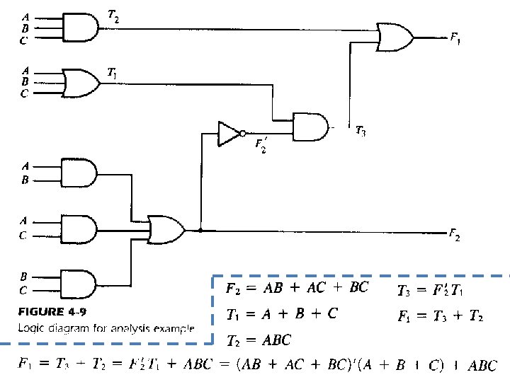 Procedure To obtain the output functions from a logic diagram, proceed as follows: 1. Label with arbitrary symbols all gate outputs that are a function of the input variables. Obtain the Boolean Functions for each gate. 2. Label with other arbitrary symbols those gates that are a function of input variables and/or preciously labeled gates. Find the Boolean functions of these gates. 3. Repeat the process in step 2 until all the outputs of the circuit are obtained. 4. By repeated substitution of previously defined functions, obtain the output Boolean functions in terms of input variables only.