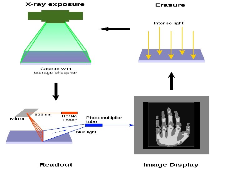 Image Acquisition CR X-ray Tube Latent image Readout Photomultipl ier Erasure ADC IP Ready Fluorescent Workstation