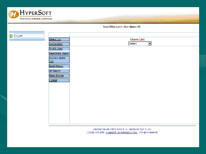 Features of Ho Admin Login 1) Option : Modify User: • This option is used to modify the head office, branch office admin user’s permissions. The following drop down list box contains Head office and branch office admin. Once you select any of the option either Head office and branch office admin displays the selected 2) Option: De-activate Users: • In deactivate users feature you are going to deactivate Head office or branch office, to do deactivate click on the Deactivate button, before doing de-activate - select user type whether Head office users or Branch office users admin. • If you select any one of the user type, it is going to display all Head Office or Branch Office list that are related to selected user type. Once I have selected branch office – all branches are displayed. If I selected Head Office – all head office lists are displayed. 3)Option : In-activate Users List: • In order to activate the deactivated users, select In-activate users list option. After clicking on to Inactivate users list the following screen will be appeared. From the following screen, select user type either Head office or Branch office to view list of head offices or branch offices