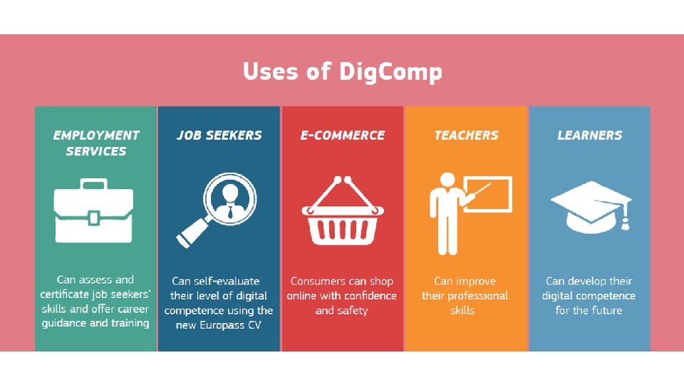 Member States shared concept for Digital Skills Targets for each focus area For each focus area/group: • Definition and anticipation • Awareness and incentives • Formation, validation and certification 1. Every day life digital skills for all citizens 2. Digital user skills for employability – the labour force (including e-leadership and new digital jobs) 4. Modernising education 3. Digital skills for ICT specialists
