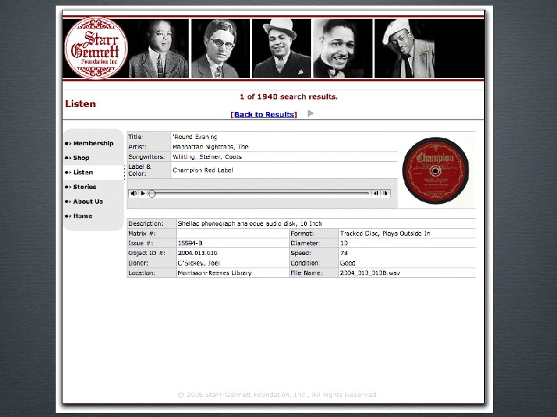 BMS/Chace provided Starr-Gennett Foundation with: • migration of 450 78 rpm discs • “data cleansing” of existing metadata (entered by volunteers using Past. Perfect) • import of newly-created metadata into Past. Perfect • creating the infrastructure for streaming (coming soon!) from their website