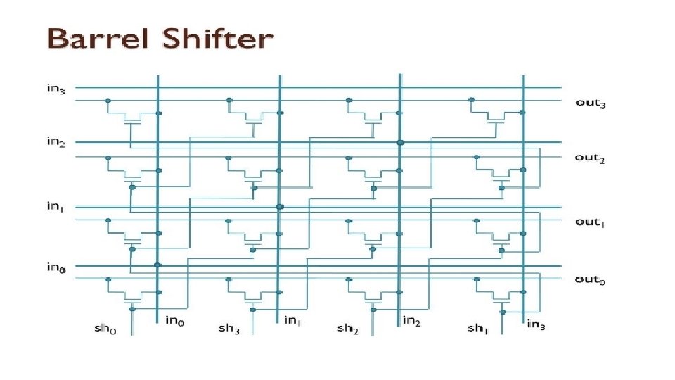 Barrel Shifter • In Binary Operation, shifting is a bitwise operation that shifts the operand I to n-1 places to the right or left • N-bit shifter is a device which shifts the input data to n-1 places to the left or right