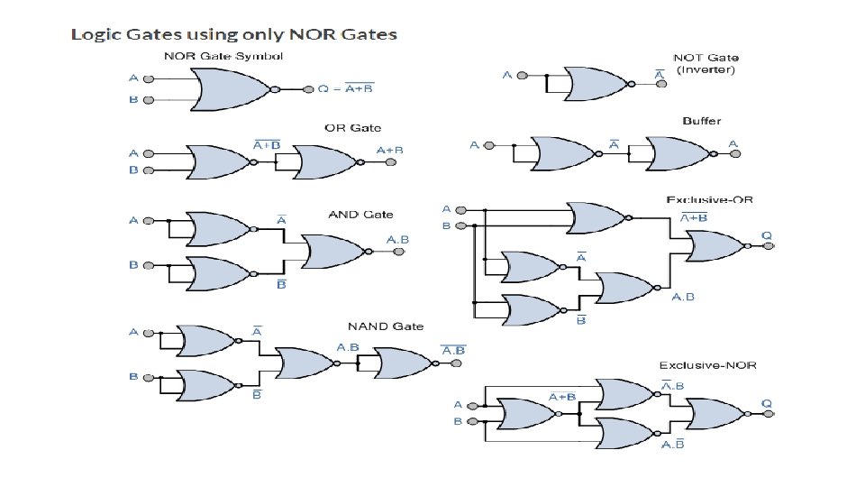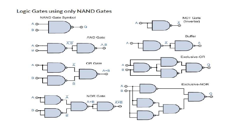 Logic Gates • Gates are identified by their function: NOT, AND, NAND, OR, NOR, EX-OR and EX-NOR. Switch S 1 AND Switch S 2 must be closed to light the lamp Switch S 1 OR Switch S 2 (or both of them) must be closed to light the lamp