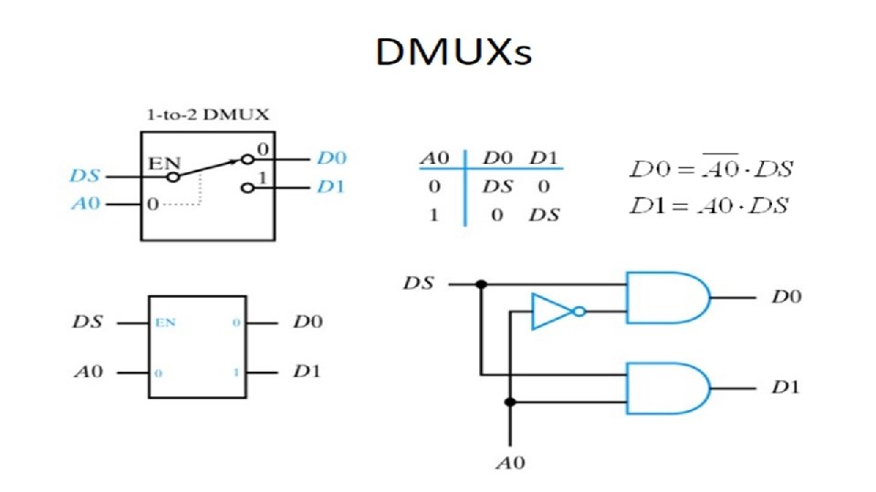 The logical level applied to the S input determines which AND gate is enabled, so that its data input passes through the OR gate to the output. The output, Y=D 0 S’+D 1 S When S=0, AND gate 1 is enabled and AND gate 2 is disabled. So, Y=DO S=1, AND gate 1 is disabled and AND gate 2 is enabled. So, Y=D 1