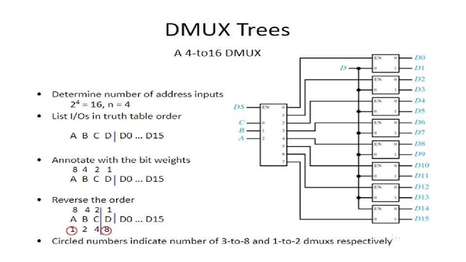 Demultiplexers (1 TO 4 DEMUX) Out 1 Out 2 Y 0 Y 1 Y 2 Out 3 Y 3 Out 0 Data In Y 0 = A'. B'. I Y 1 = A. B'. I Y 2 = A'. B. I Y 3 = A. B. I S 1 S 0 A B Y 0 Y 1 Y 2 Y 3 0 0 I 0 0 1 0 0 0 I 0 1 1 0 0 0 I