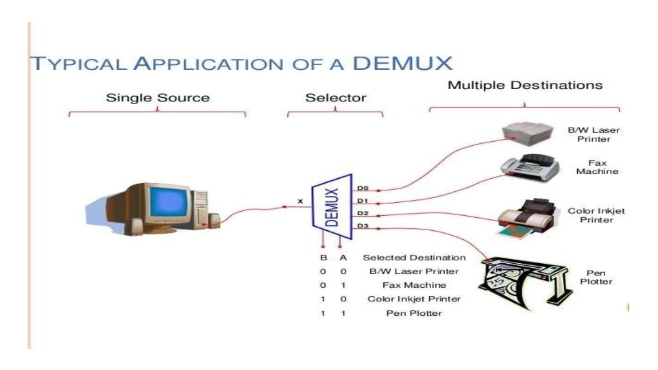Demultiplexers A demultiplexer has N control inputs 1 data input 2 N outputs A demultiplexer routes (or connects) the data input to the selected output. The value of the control inputs determines the output that is selected. A demultiplexer performs the opposite function of a multiplexer. Types Of Demultiplexer De-multiplexers are classifiedinto four types: 1 -2 demultiplexer (1 select line) 1 -4 demultiplexer (2 select lines) 1 -8 demultiplexer (3 select lines) 1 -16 demultiplexer (4 select lines)