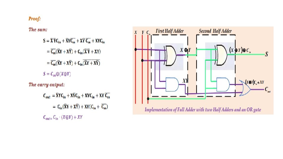 The logic diagrams for the full adder implemented in sum-of-products form are the following: It can also be implemented using two half adders and one OR gate (using XOR gates).
