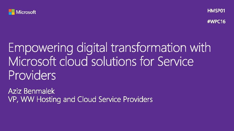 Monday July 11, 2016 Program Key GTM & Partnership Infrastructure Licensing Applications HMSP 01 Empowering digital transformation with Microsoft cloud solutions for hosting, cloud and managed service providers North 105 1: 00 – 2: 00 PM HMSP 02 Success with Azure: Transform your business with Microsoft Azure South 713 AB 2: 30 – 3: 30 PM HMSP 03 Selling SQL: Grow your SQL business with SQL offers and programs for hosting partners South 713 AB 4: 00 – 5: 00 PM Tuesday July 12, 2016 HMSP 04 Skype for Business Online: Overview, sales scenarios, go-to-market motions for SMB through the Cloud Solution Provider (CSP) program South 713 AB 1: 00 – 2: 00 PM HMSP 05 What is the magic Office 365 customer formula for Cloud Solution Provider (CSP) partners? Top lessons learned from Go. Daddy and Rackspace South 713 AB 2: 30 – 3: 30 PM HMSP 06 Building a best practice partnership: The evolution of cloud, collaboration and opportunity South 709 2: 30 – 3: 30 PM HMSP 07 Migrating from hosted Exchange to Office 365: What should you know South 713 AB 4: 00 – 5: 00 PM HMSP 08 A practical look at CSP offers, billing and monetization South 709 4: 00 – 5: 00 PM Wednesday July 13, 2016 HMSP 09 The next frontier: Managed services on Microsoft Azure – seize the opportunity and grow revenue and profits South 713 AB 1: 00 – 2: 00 PM HMSP 10 Hybrid licensing South 709 1: 00 – 2: 00 PM HMSP 11 Keys to building a strong EMS offer and sales practice with the Cloud Solution Provider (CSP) program South 713 AB 2: 30 – 3: 30 PM HMSP 12 No Usage=No Revenue! Understanding the Cloud Customer journey for selling and driving consumption of Office 365 South 709 2: 30 – 3: 30 PM HMSP 13 Making hybrid cloud real with Azure Stack South 713 AB 4: 00 – 5: 00 PM