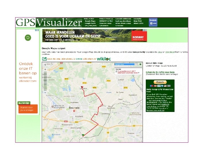 Routekaart op papier afdrukken • Runnersmap biedt beperkte afdrukmogelijkheid. Bovendien verlies van resolutie. • Via GPSVisualizer is download naar HTML mogelijk. Afdrukken in Internet Explorer is mogelijk tot A 3 -formaat.