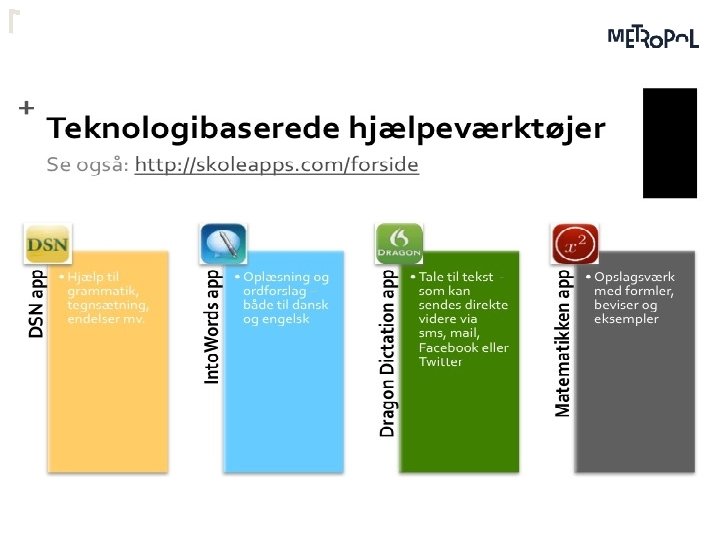 Skolen i videnssamfundet (Sørensen, Audon & Levinsen, 2010) § Læreren som facilitator § Læreren som medlærer § Elev-/studenterstyret læring § Projekt- og problembasering § Virkelighed/konkrete handlinger og refleksioner § Gruppe-/fællesskabsfokus § Computer som redskab for læring (lær med og gennem it) § Dynamiske medieproduktioner