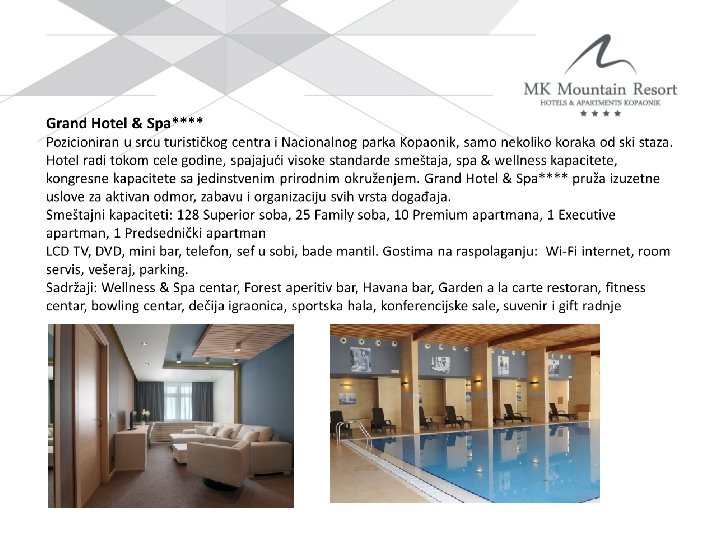 • MK Mountain Resort je osnovan 2008. godine kao deo MK Group holding kompanije. • Kompanija posluje u okviru holding kompanije MK Group, jednog od najuspešnijih poslovnih sistema u Srbiji u čijem sastavu se nalazi više od 35 povezanih preduzeća koja posluju u zemlji i inostranstvu. • Nalazi se na Kopaoniku, najprestižnijem ski centru u Srbiji i jednom od najvećih u regionu. • Sa više od 1. 300 ležaja MK Mountain Resort predstavlja najveći hotelski kompleks na Kopaoniku. • MK Mountain Resort raspolaže Kongresnim centrom od 1000 m 2, maksimalnog kapaciteta za 1. 200 učesnika, predstavlja jedan od vodećih kongresnih centara u Srbiji. • Brands: Grand Hotel & Spa****, Family Hotel Angella****, Apartments Konaci ****