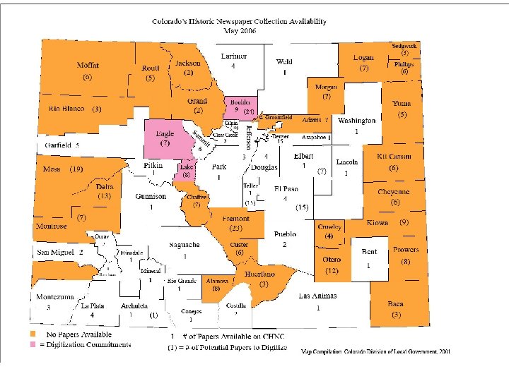 Collection Development n General policies: n n n Historic newspapers published in Colorado Start with earliest available published issue of a title and move forward chronologically Some donations allowed selection criteria n n worked with CO historians on some regions Currently driven by donations Target fundraising efforts to counties with no papers online Focus on issues published prior to 1923 due to copyright concerns