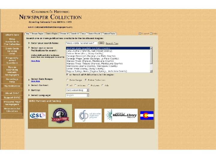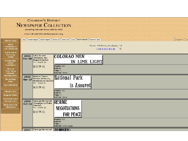 Colorado’s Historic Newspaper Collection n As of June 2006 n n n 93 newspapers 50 cities represented 36 counties represented Around 327, 000 pages digitized Coverage from 1859 to 1930 Includes papers in English, German, Spanish, and Swedish