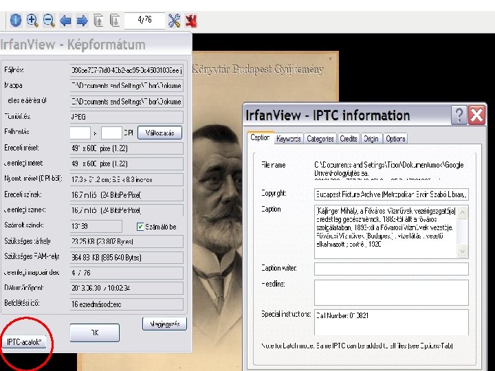 2. A fényképek tartalmi feldolgozása és leírása/2 Alapfok Kutathatóság biztosítása önfeltáró rendszer: csoportosítás, típus, méret és tematika szerint, szekrénykataszter, mutatók, segédletek csoportos és egyedi azonosítók rendszere Leírás Számítógépes irodai alkalmazások (szegmentálás, forma legyen könyvtári). Kiegészítő lehetőség: IPTC (EXIF) információk beépítése a képfájlba Irfan. View, Xn. View, Picasa, keresés, automatizálás