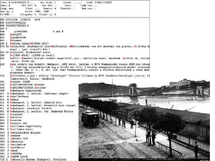 2. A fényképek tartalmi feldolgozása és leírása/3 Adatbázis, lehetőleg nagy könyvtári vagy egyéb gyűjteménykezelői rendszerekbe integrálva (FSZEK, PIM, BFL, Levéltári Portál, UNITAS) Metaadat szabványok, metadadat-struktúrák, adatcsere-formátumok cél: a kompatibilitás, konvertálhatóság, szabványosság, a „szüretelhetőség”, vagyis a megközelíthetőség más rendszerek számára Számunkra a MARC kínálkozik és az ISBD-szabványok
