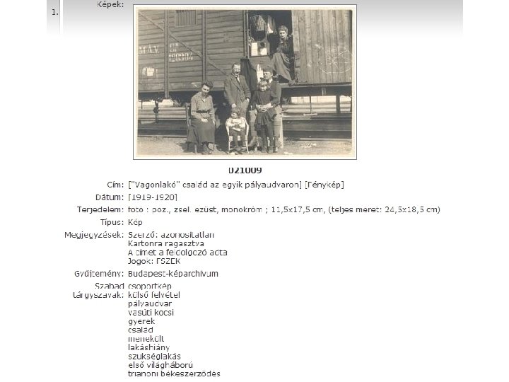 2. A fényképek tartalmi feldolgozása és leírása/1 Feldolgozás első lépései a könyvtárosi attitűd mellett muzeológusit igényel: 1. Dokumentumleírás mellett azonosítás, adatolás a forráskörnyezet feltárása, a járulékos információk megőrzése (származás, keletkezéstörténet, kapcsolódó források, oral history / riport), analógiák keresése „A selejt bosszúja” 2. Osztályozás mellett értelmezés mit dokumentál, mire használható a kép és a gyűjteményrész, kitekintést a kapcsolódásokra, más gyűjtemények hasonló anyagaira