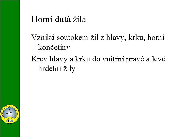 Horní dutá žíla – Vena cava superior Vzniká soutokem žil z hlavy, krku, horní končetiny Krev hlavy a krku do vnitřní pravé a levé hrdelní žíly vena jugularis interna dexter at sinister