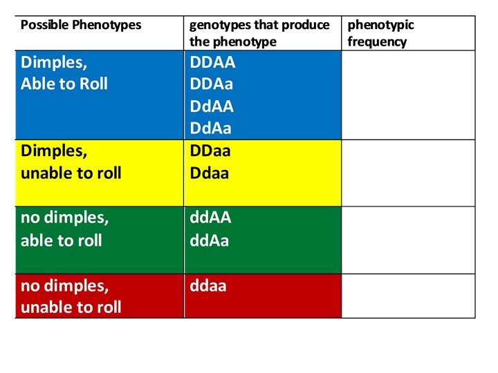 Possible Phenotypes genotypes that produce the phenotype Dimples, Able to Roll Dimples, unable to roll no dimples, unable to roll DDAA DDAa Dd. AA Dd. Aa DDaa Ddaa dd. AA dd. Aa ddaa phenotypic frequency 9 3 3 1