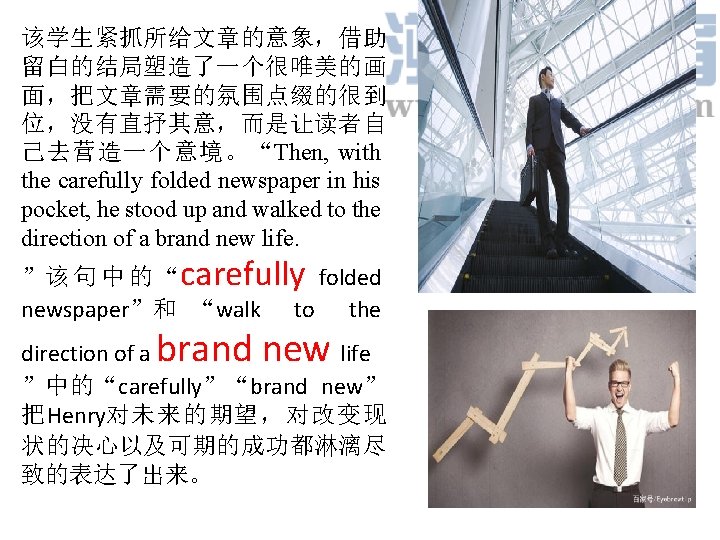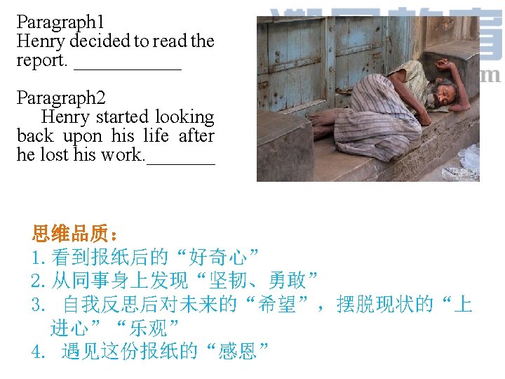 Carl and Henry worked in the same company. One day they were both called into the manager’s office. They were informed that they were fired. It was a big hit to both of them. Carl had a family to support. He knew he must keep earning money, or his family would suffer hunger. However, he also knew he had got fired of working at the company. “Maybe it’s a good opportunity for me to start my own business, ” he said to himself. After talking with his wife, he made a decision to start a career that he had always wanted to do. It was the first time for him to do business. So it was not surprising that things didn’t go well at first. However, Carl didn’t get discouraged. He worked hard and gradually his business got better and better. As a result, his business went so well that it expanded quickly. So what did Henry do after he lost his work? Well, he reacted quite differently. “Why me? ” he asked, “Why did such a bad thing happen to me? It’s so unfair!” Instead of thinking about what to do later, Henry kept complaining. “You should go to work again, or you’ll become homeless, ” his friends said to him. But Henry didn’t listen. He couldn’t stop thinking that life was unfair to him. The more he thought like that, the more he didn’t want to find work. What was worse, he started drinking alcohol. At last, he even couldn’t afford the rent and had to sleep on the street. As his friends had warned him, he became homeless. One day, while sitting by the street, Henry was given a newspaper by a passer-by. It was cold that day and the passer-by thought that a newspaper might help keep him warm a bit. By chance, Henry saw a picture of a man in the newspaper, and there was a report about the man. He thought the man in the picture was a bit familiar to him. But he couldn’t remember who he was. Paragraph 1 Henry decided to read the report. _______________________ Paragraph 2 Henry started looking back upon his life after he lost his work. ____________