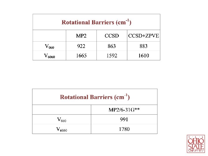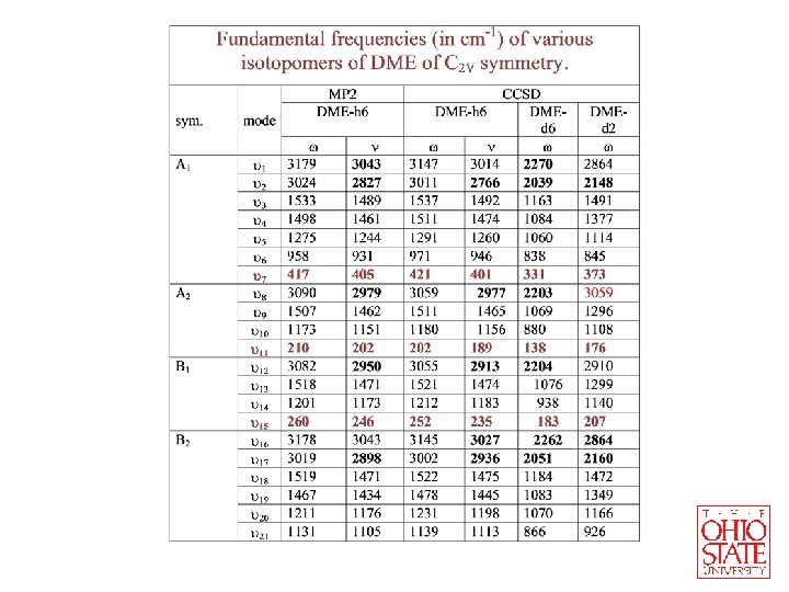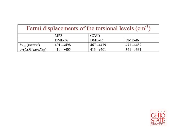 Fundamental frequencies (in cm-1) COC Bending � 7 CH 3 Torsion � 15 CH 3 Torsion � 11 MP 2/6 -31 G** MP 2/aug-cc-p. VTZ CCSD/aug-cc-p. VTZ (Variational) (PT) Exp. 430 405 420 401 412 245 246 234 235 241 193 202 191 189