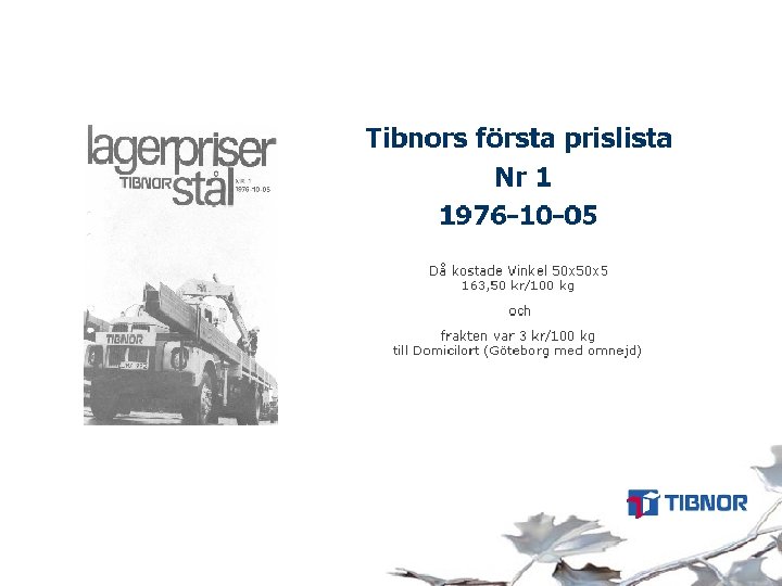 TIBNORFAKTA Exempel på leverantörspartners: SSAB Tunnplåt, SSAB Oxelösund, Rautaruukki, Imatra, Ovako, Fundia, Arcelor, Salzgitter, Outokumpu, Thyssen. Krupp. Nirosta Hydro Aluminium Exempel på produktionspartners: Dickson SSC, EME Eriksson, Ib Andresen, Bandstål B Nilsson, Atcab