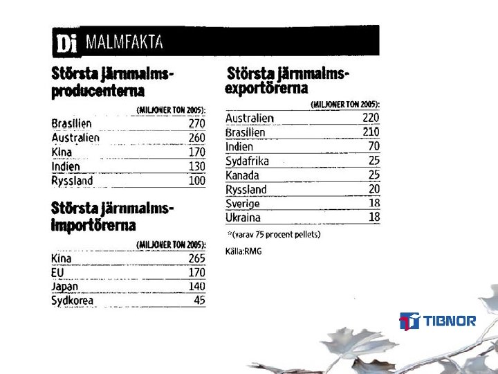 Kinafaktorn • 2003 importerade Kina 148 Mton järnmalm +30% mot 2002 • 50% av behoven av järnmalm importeras • 2004 -2006 beräknas produktionskapaciteten öka 90 Mton!