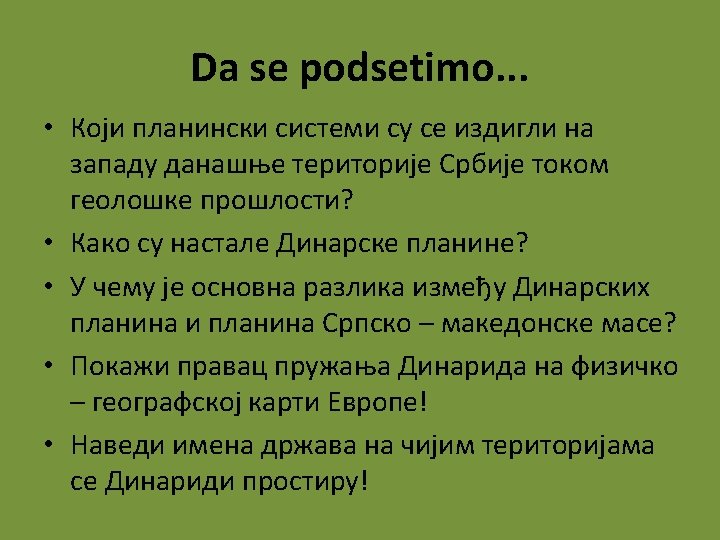 Da ponovimo. . . • Nabroj planinske sisteme koji pripadaju Centralnim Dinaridima. • Nabroj planinske sisteme koji pripadaju Unutrašnjim Dinaridima. • U kom delu Srbije se prostiru oblasti Stari Vlah i Raška? • Šta je Ravni Kopaonik? • Koja Šumadijska planina je poznata po proizvodnji mermera?