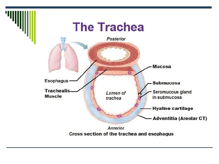 Dušnik (trachea) o Šuplji, cjevasti organ o Povezuje grkljan-vrat-prsna šupljina-račvanje (bifurcatio tracheae) o Razlikujemo: -vratni dio -prsni dio o Građen od hrskavičnih prstenova o Povezani vezivno-tkivnim ligamentima o Dorzalno mišić o Sluznica naborana, sadrži žlijezde